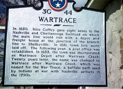 In 1851 Rice Coffee donated eight acres of land to the newly chartered Nashville and Chattanooga Rail Road to attract the proposed line to eastern Bedford County. Wartrace Depot came into existence when the N&C was completed in 1852. On October 3rd. 1853 a formal charter was granted to Wartrace Depot which was eventually shortened to Wartrace.